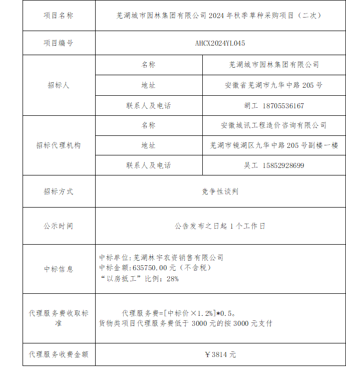 蕪湖城市園林集團(tuán)有限公司2024年秋季草種采購成交結(jié)果公告(二次)